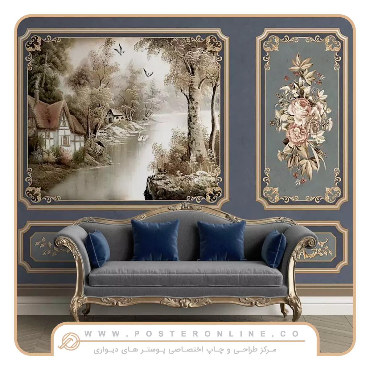طراحی و طیف رنگی ملایم این پوستر، به راحتی با مبلمان کلاسیک چوبی (به خصوص با روکشهای مخمل یا پارچههای طرحدار)، پردههای ضخیم و طرحدار، لوسترهای کریستالی و اکسسوریهای آنتیک هماهنگ میشود. رنگهای کرم، بژ، قهوهای روشن و سبز زیتونی در کنار جزئیات طلایی، بهترین مکمل برای این اثر هنری خواهند بود.